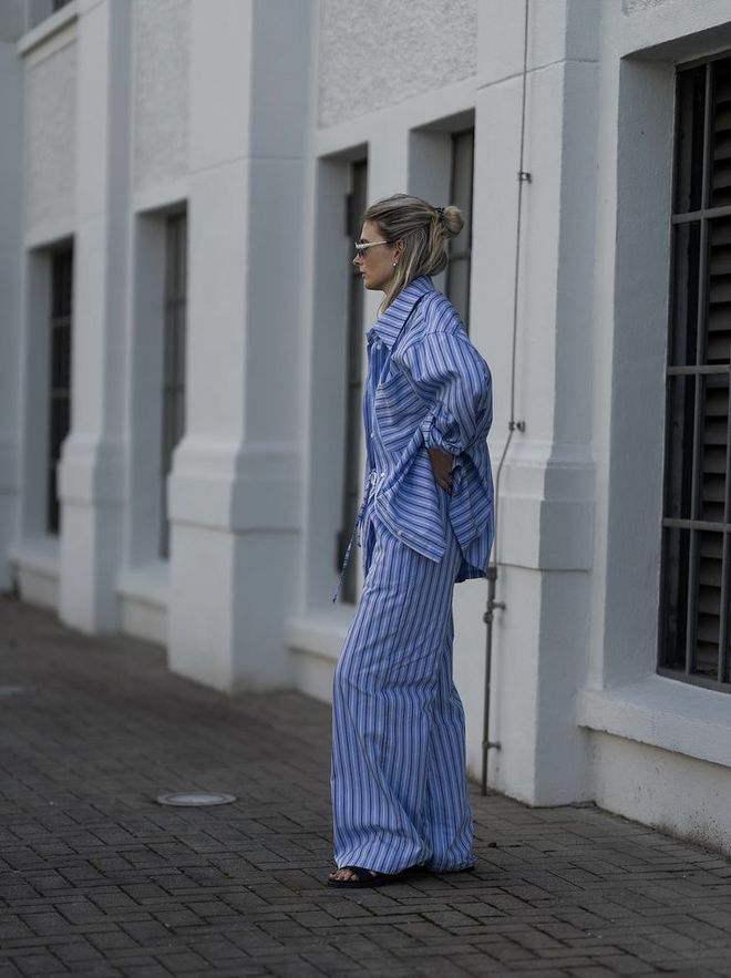 在casual business的半正式场合, 也可以用版型硬挺的阔腿裤, 正式感强的配饰提升精致度,削弱休闲感。